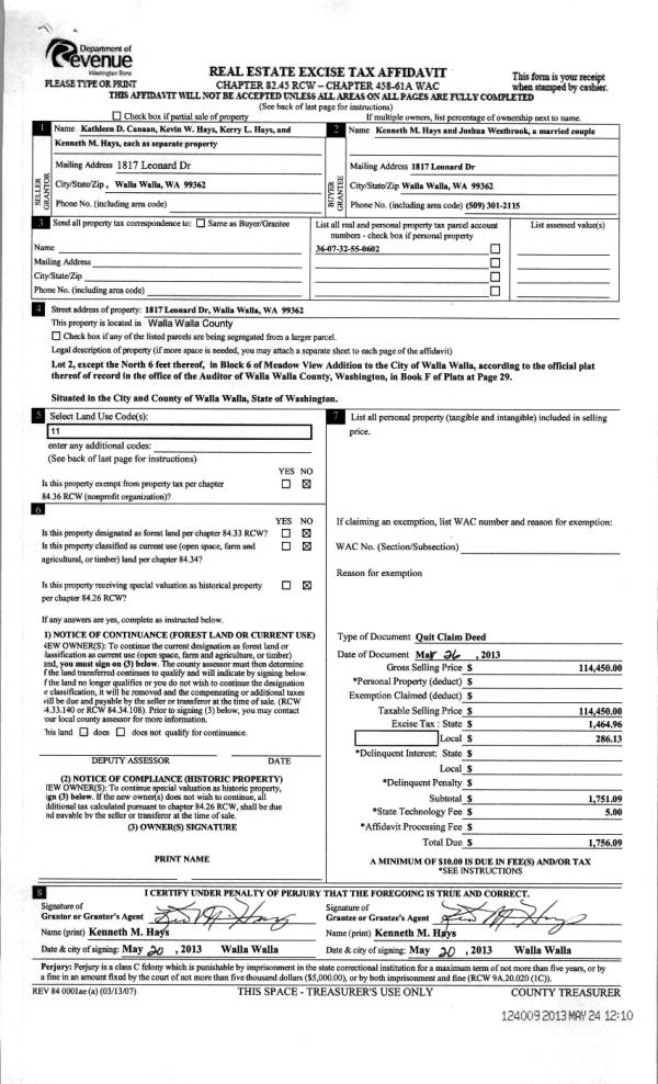 | 4 | 05/24/2013 | QCD | QUIT CLAIM DEED | HAYS, KEVIN W ET AL | HAYS, KENNETH M | | | $114,450.00 | 124009 | 2013-05245 |