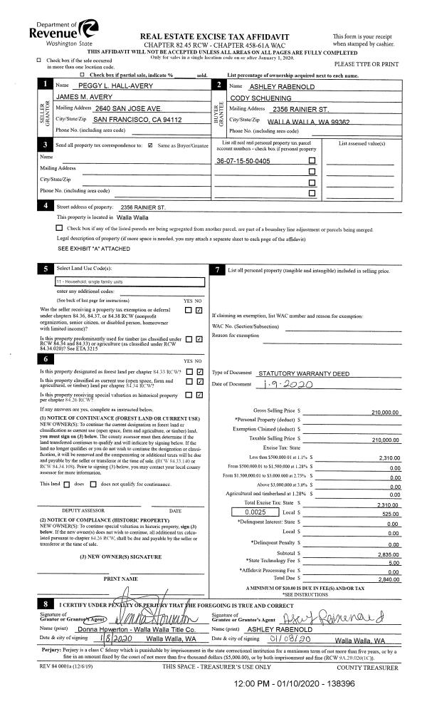 | 2 | 01/10/2020 | SWD | STATUTORY WARRANTY DEED | AVERY JAMES M & PEGGY L HALL-AVERY | ASHLEY RABENOLD | | | $210,000.00 | 138396 | 2020-00256 |
