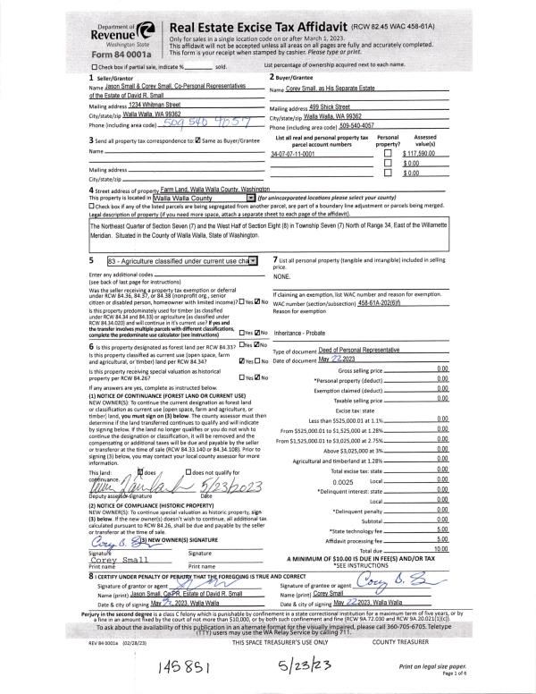 | 1 | 05/23/2023 | DPR | DEED OF PERSONAL REPRESENTATIVE | SMALL DAVID R ESTATE OF | SMALL COREY | | | | 145851 | 2023-02772 |
