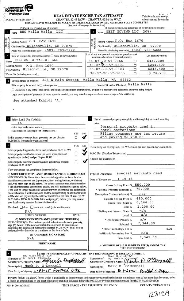 | 2 | 06/17/2015 | SWP | Special Warranty Deed | BHG WALLA WALLA LLC | BHG WALLA WALLA LLC | | 4-PARCELS | $480,000.00 | 128159 | 2015-05066 |