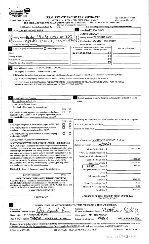 | 1 | 04/26/2019 | SWD | STATUTORY WARRANTY DEED | BURR JAY RAYMOND | DAVY MATTHEW & JENNIFER | | | $340,000.00 | 136763 | 2019-02673 |