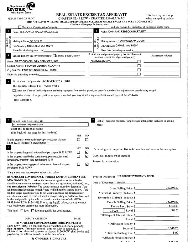 | 3 | 11/04/2015 | SWD | STATUTORY WARRANTY DEED | BELLA VIDA WALLA WALLA LLC | BARTLETT JOHN WESLEY & REBECCA LOUISE | | | $362,500.00 | 129138 | 2015-09625 |