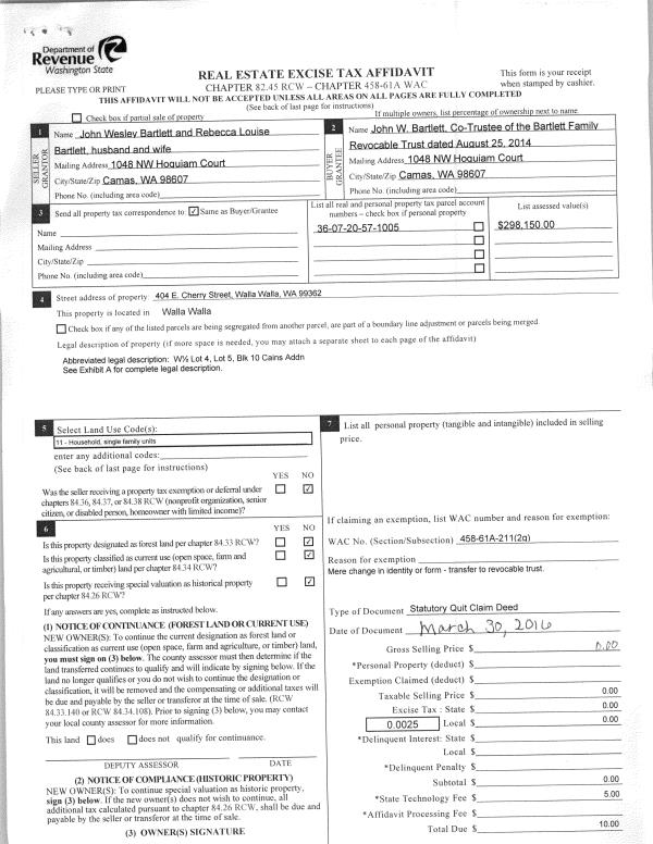 | 2 | 03/30/2016 | QCD | QUIT CLAIM DEED | BARTLETT JOHN WESLEY & REBECCA LOUISE | BARTLETT FAMILY REVOCABLE TRUST | | | | 129947 | 2016-02456 |