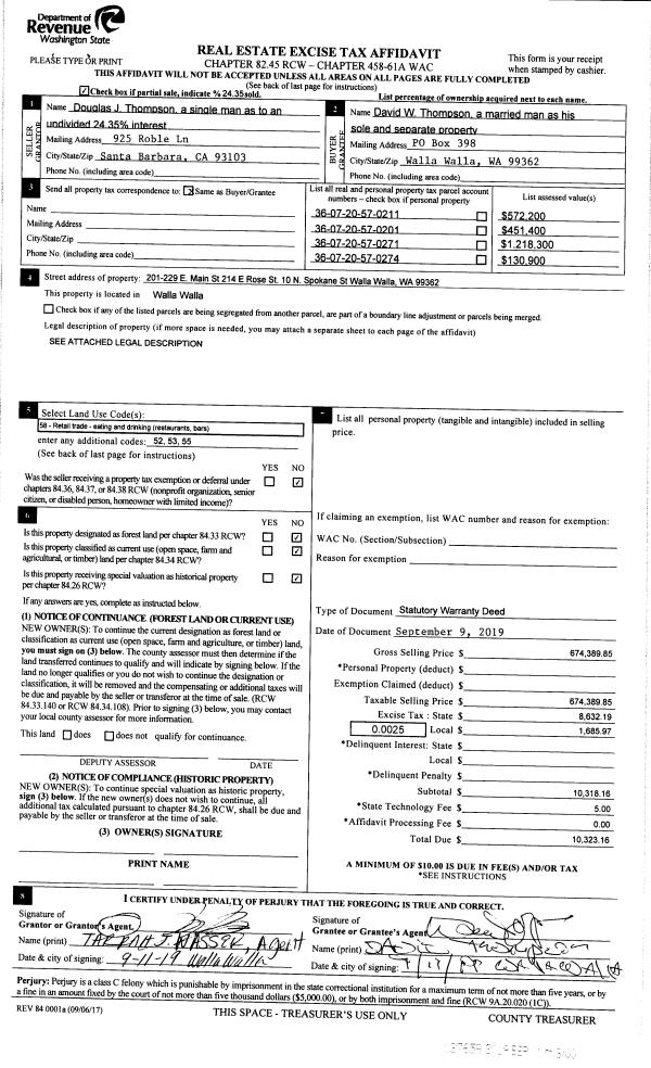 | 2 | 09/11/2019 | SWD | STATUTORY WARRANTY DEED | THOMPSON DAVID W ET AL | THOMPSON DAVID W | | 4-PARCLES | $674,390.00 | 137659 | 2019-07070 |