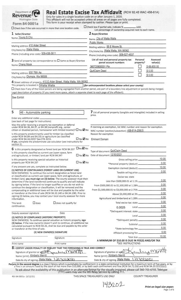| 1 | 01/06/2022 | QCD | QUIT CLAIM DEED | | WALLA WALLA CITY OF | | | | 143202 | 2022-0022 |