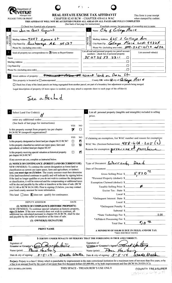 | 2 | 05/05/2014 | WARRANTY D | WARRANTY DEED | | COLLEGE PLACE CITY OF | | | | 125836 | 2014-03066 |