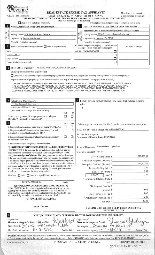 | 2 | 11/17/2014 | TRUSTEES D | TRUSTEE'S DEED | KREUTZ CHAD & KATHRYN | CP-SRMOF II 2012-A TRUST | | | $129,000.00 | 126950 | 2014-08344 |