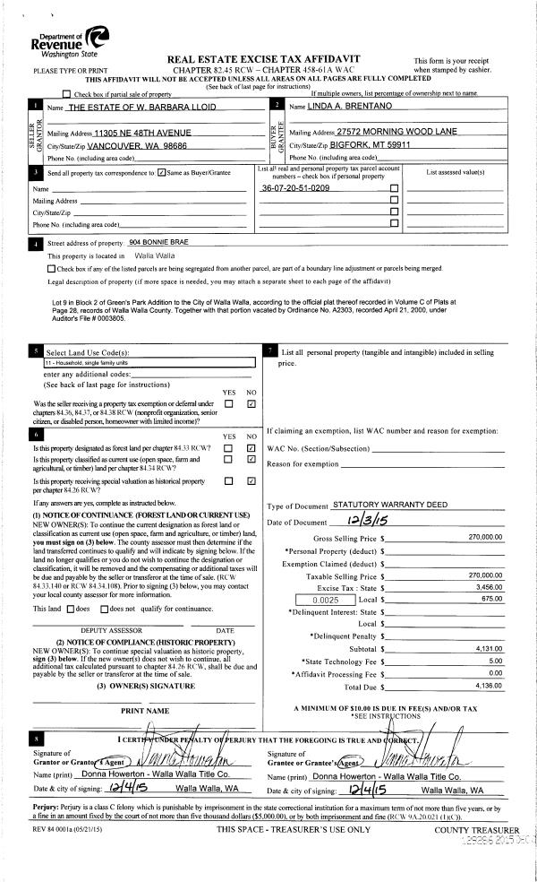 | 3 | 12/04/2015 | SWD | STATUTORY WARRANTY DEED | LLOID W BARBARA ESTATE OF | BRENTANO LINDA A | | | $270,000.00 | 129286 | 2015-10388 |