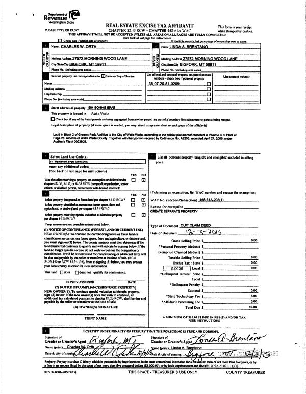 | 2 | 12/04/2015 | QCD | QUIT CLAIM DEED | ORTH CHARLES W | BRENTANO LINDA A | | | | 129287 | 2015-10389 |