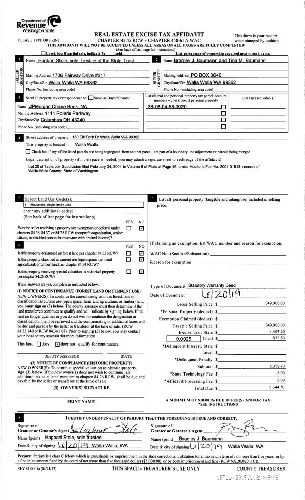 | 2 | 06/21/2019 | SWD | STATUTORY WARRANTY DEED | STOLE HAGBART & ALICE TRUSTEES OF THE | BAUMANN BRADLEY J & TINA M | | | $349,000.00 | 137114 | 2019-04340 |