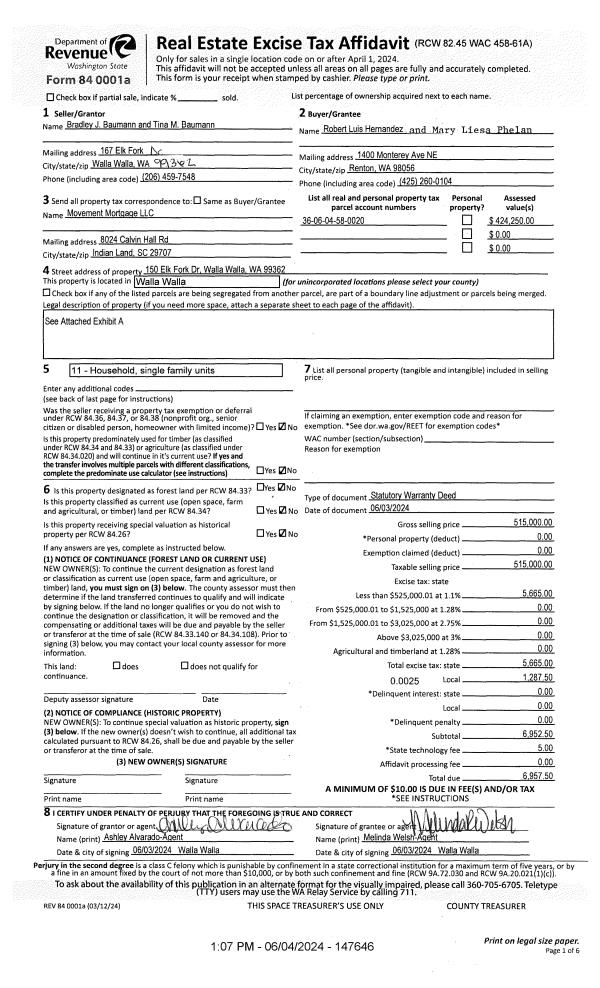| 1 | 06/04/2024 | SWD | STATUTORY WARRANTY DEED | BAUMANN BRADLEY J & TINA M | HERNANDEZ ROBERT LUIS | | | $515,000.00 | 147646 | 2024-02936 |