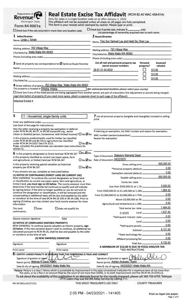 | 1 | 04/23/2021 | SWD | STATUTORY WARRANTY DEED | SCHAB LINDA J | LAU TING SUN SAMUEL & HEIDI SIU SHAN | | | $655,000.00 | 141405 | 2021-04810 |