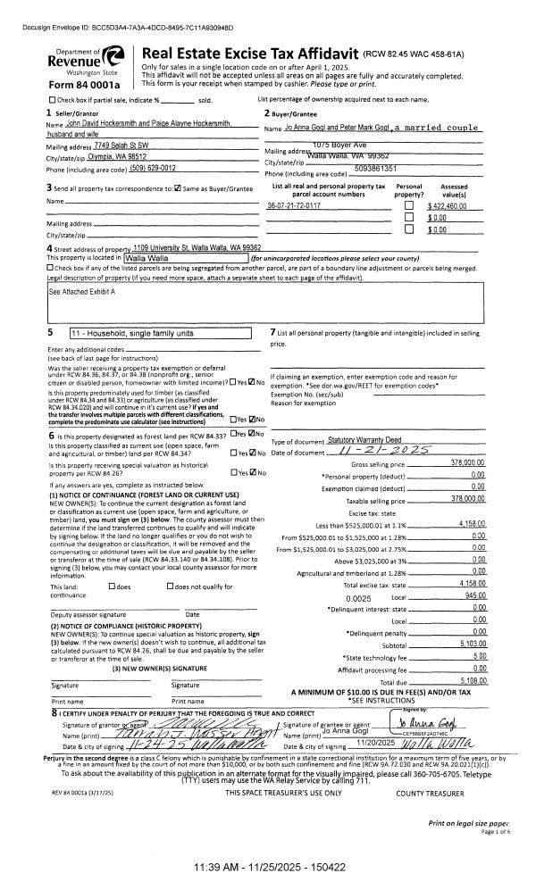 | Mailing Address: | 1109 UNIVERSITY ST WALLA WALLA, WA 99362 | % Ownership: | 100.0000000000% |