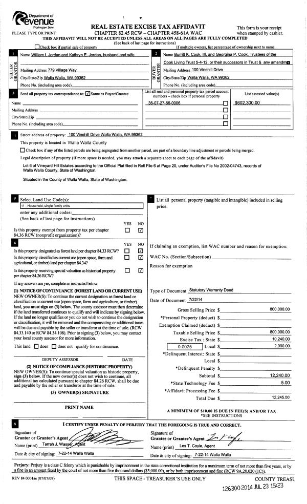 | 1 | 07/23/2014 | SWD | STATUTORY WARRANTY DEED | JORDAN WILLIAM I | COOK LIVING TRUST | | | $800,000.00 | 126300 | 2014-05181 |