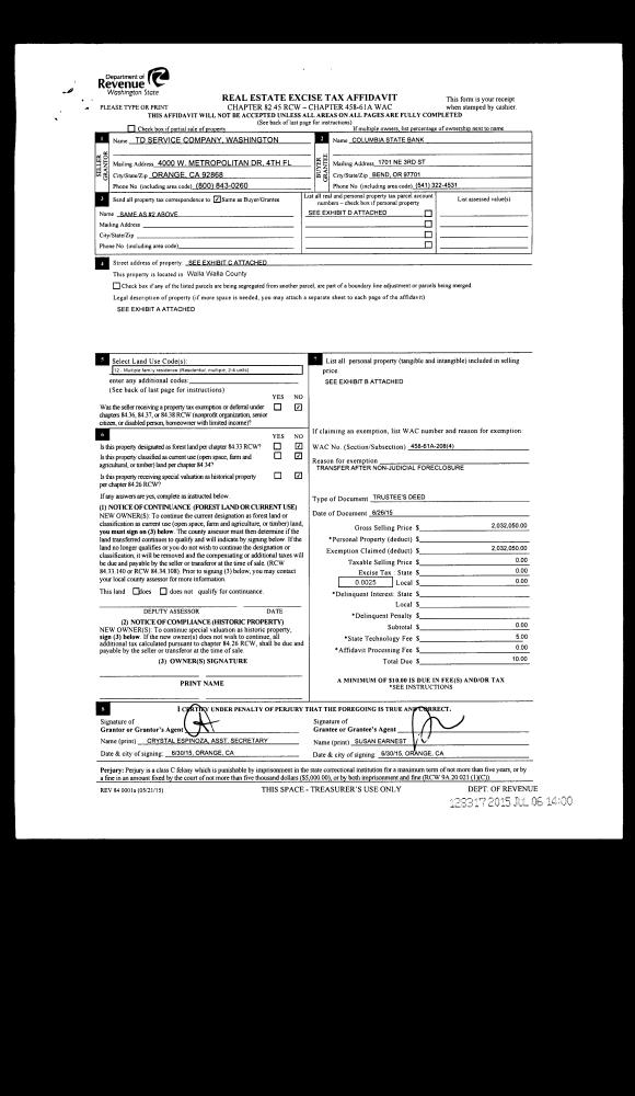 | 2 | 07/06/2015 | TRUSTEES D | TRUSTEE'S DEED | CAMBER LLC | COLUMBIA STATE BANK | | 17-PACELS | $2,032,050.00 | 128317 | 2015-05725 |
