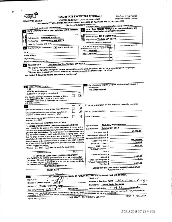 | 1 | 10/26/2018 | SWD | STATUTORY WARRANTY DEED | RIANI ANTHONY | PANIAGUA JOSE ALBERTO | | 2-PARCELS | $185,000.00 | 135813 | 2018-08879 |
