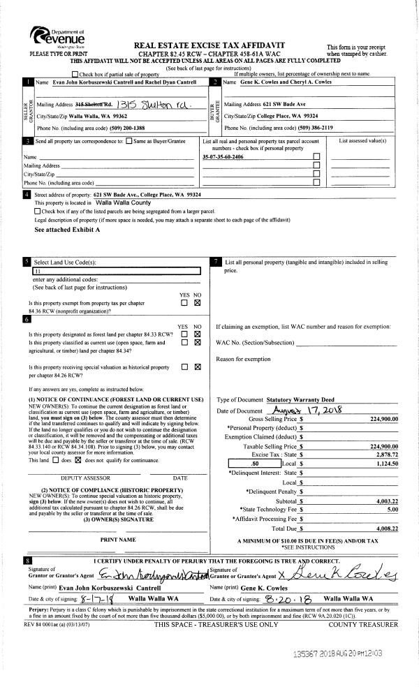 | 1 | 08/20/2018 | SWD | STATUTORY WARRANTY DEED | CANTRELL EVAN JOHN KORBUSZEWSKI | COWLES GENE K & CHERYL A | | | $224,900.00 | 135367 | 2018-06812 |