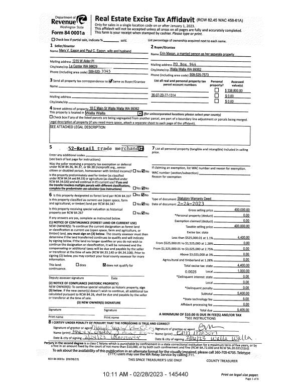 | 1 | 02/28/2023 | SWD | STATUTORY WARRANTY DEED | EAGON PAUL C & MARY V | MASON ERIN | | | $400,000.00 | 145440 | 2023-00989 |