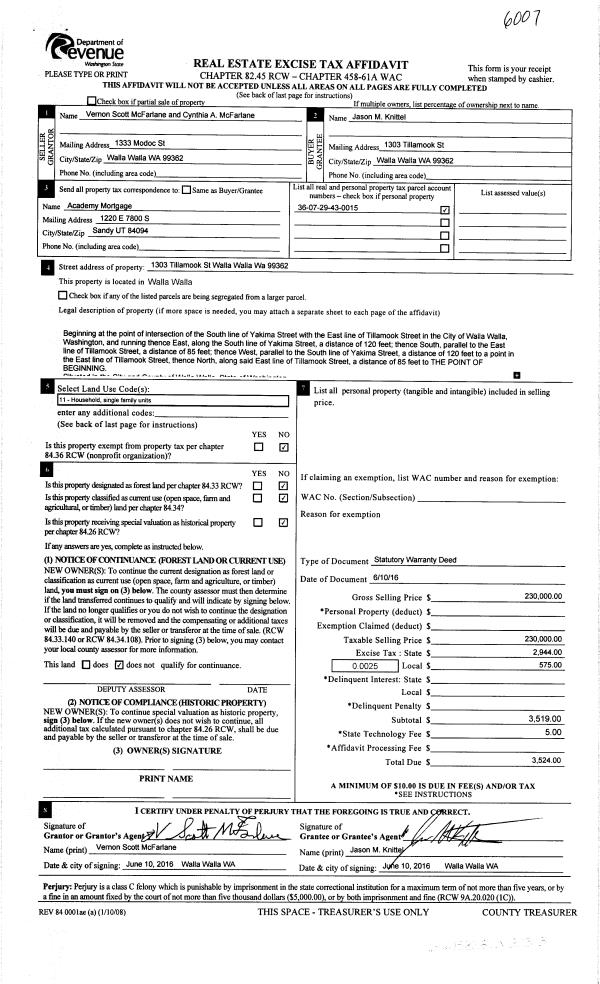 | 2 | 06/13/2016 | SWD | STATUTORY WARRANTY DEED | MC FARLANE VERNON S & CYNTHIA A | KNITTEL JASON MONTGOMERY | | | $230,000.00 | 130405 | 2016-04481 |