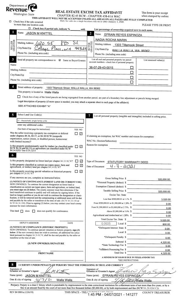 | 1 | 04/07/2021 | SWD | STATUTORY WARRANTY DEED | KNITTEL JASON MONTGOMERY | ESPINOZA EFRAIN REYES | | | $320,000.00 | 141277 | 2021-04049 |
