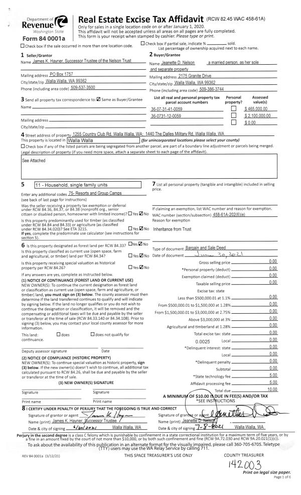 | 2 | 06/30/2021 | BARGAIN & | BARGAIN & SALE DEED | NELSON CHARLES R TRUSTEE OF THE NELSON TRUST | NELSON JEANETTE | | 2 PARCELS | $0.00 | 142003 | 2021-08285 |