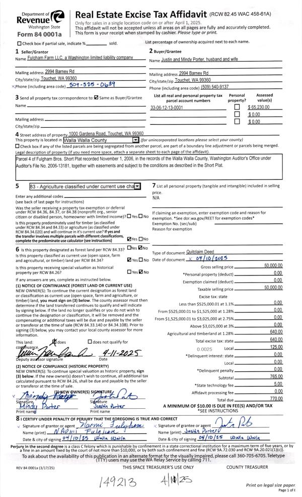 | 1 | 04/11/2025 | QCD | QUIT CLAIM DEED | FULGHAM FARM LLC | PORTER JUSTIN & MINDY | | | $50,000.00 | 149213 | 2025-01910 |