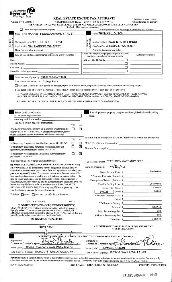| 2 | 11/01/2016 | SWD | STATUTORY WARRANTY DEED | DUNCAN HARRIETT L TRUSTEE OF THE | OLSON THOMAS L | | | $258,000.00 | 131365 | 2016-09078 |