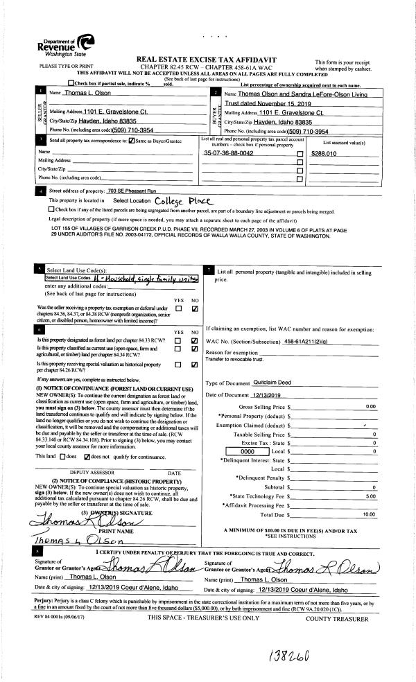 | 1 | 12/13/2019 | QCD | QUIT CLAIM DEED | OLSON THOMAS L | OLSON THOMAS & SANDRA LEFORE LIVING TRUST | | | $0.00 | 138260 | 2019-10428 |