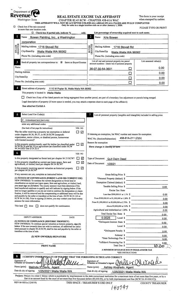| 1 | 01/25/2021 | QCD | QUIT CLAIM DEED | BOWEN PAINTING INC | BOWEN KRIS | | | $0.00 | 140797 | 2021-00990 |