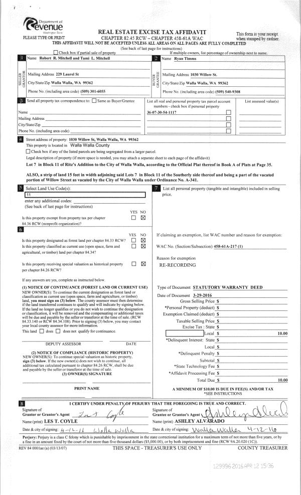 | 2 | 03/29/2016 | SWD | STATUTORY WARRANTY DEED | MITCHELL ROBERT R & TAMI L | TIMMS RYAN | | | $0.00 | 129996 | 2016-02638 |