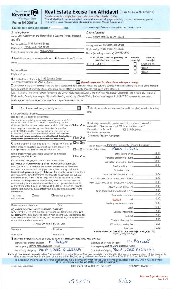 | Mailing Address: | MARTINE PURCELL 1135 BONSELLA WALLA WALLA, WA 99362 | % Ownership: | 100.0000000000% |