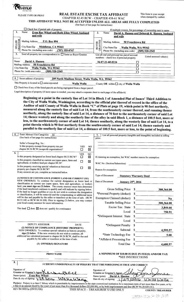 | 1 | 01/29/2016 | SWD | STATUTORY WARRANTY DEED | WITZEL EVAN ROY & RUTH ELLEN | HANSEN DAVID A & DEBORAH K | | | $300,364.00 | 129586 | 2016-00682 |