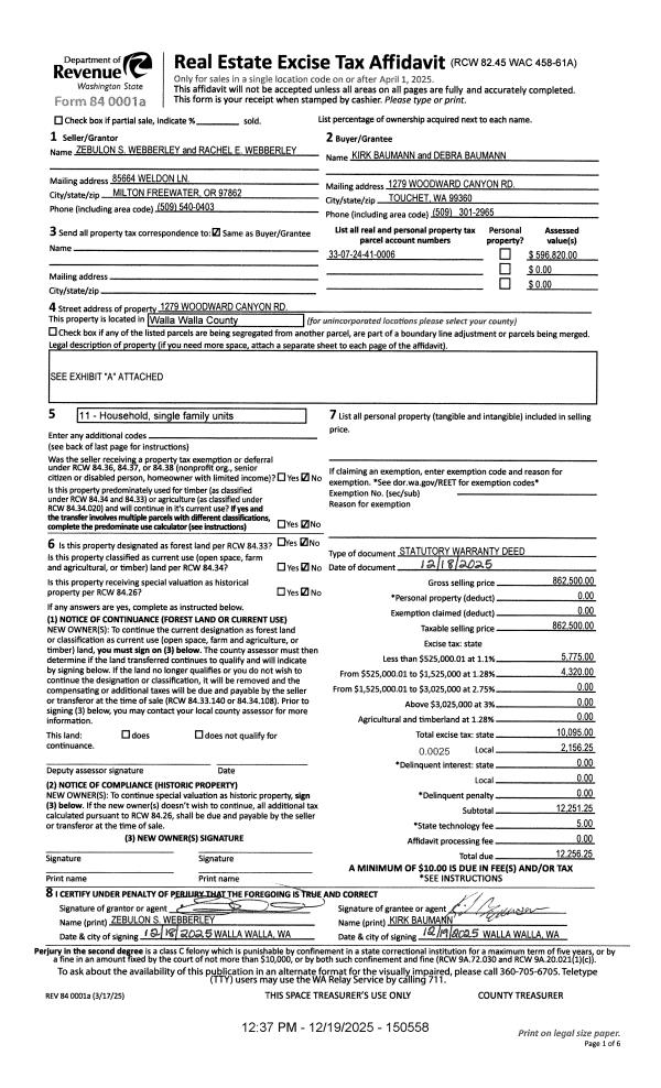 | 1 | 12/19/2025 | SWD | STATUTORY WARRANTY DEED | WEBBERLEY ZEBULON S & RACHEL E | BAUMANN KIRK & DEBRA | | | $862,500.00 | 150558 | 2025-07835 |