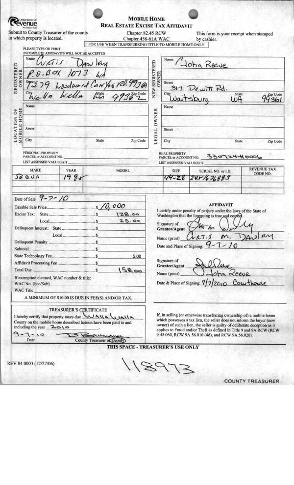 | 5 | 09/07/2010 | WARRANTY D | WARRANTY DEED | DAWLEY, CURTIS M & DIANE M | REEVE, JOHN | | | $10,000.00 | 118973 | -118973 |