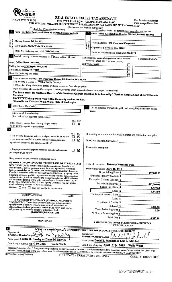 | 3 | 04/27/2015 | SWD | STATUTORY WARRANTY DEED | DAWLEY CURTIS M & DIANE M | MITCHELL DAVID B & LORI A | | | $457,000.00 | 127847 | 2015-03409 |