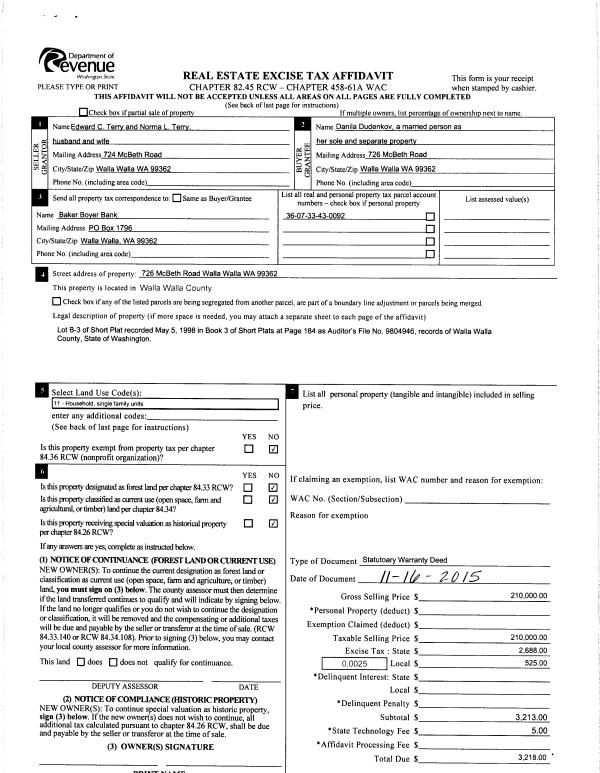 | 2 | 11/20/2015 | SWD | STATUTORY WARRANTY DEED | TERRY EDWARD C & NORMA L | DUDENKOV DANILA | | | $210,000.00 | 129226 | 2015-10047 |