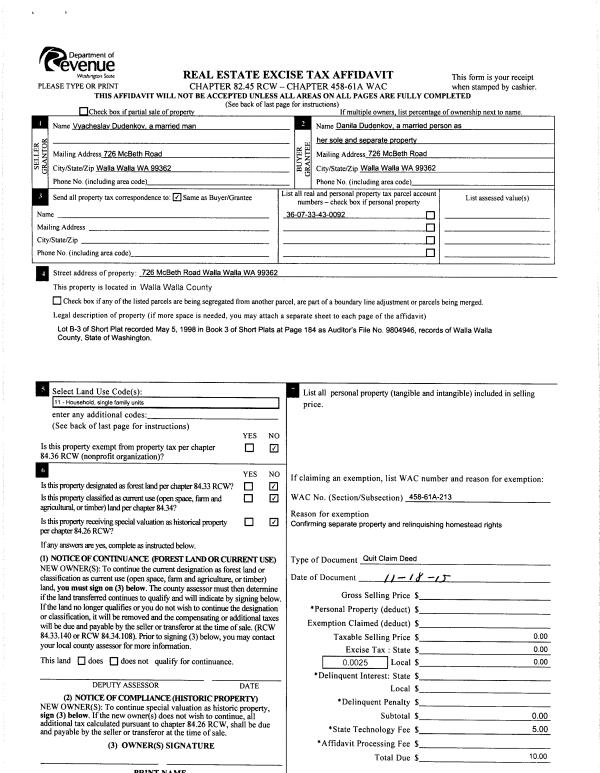 | 1 | 11/20/2015 | QCD | QUIT CLAIM DEED | DUDENKOV VYACHESLAV | DUDENKOV DANILA | | | | 129227 | 2015-10048 |