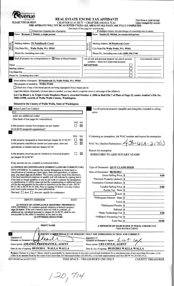 | 4 | 09/06/2011 | QCD | QUIT CLAIM DEED | MELIAH, BRENNAN J | MELIAH, SANDRA K | | | | 120645 | 2011-06947 |