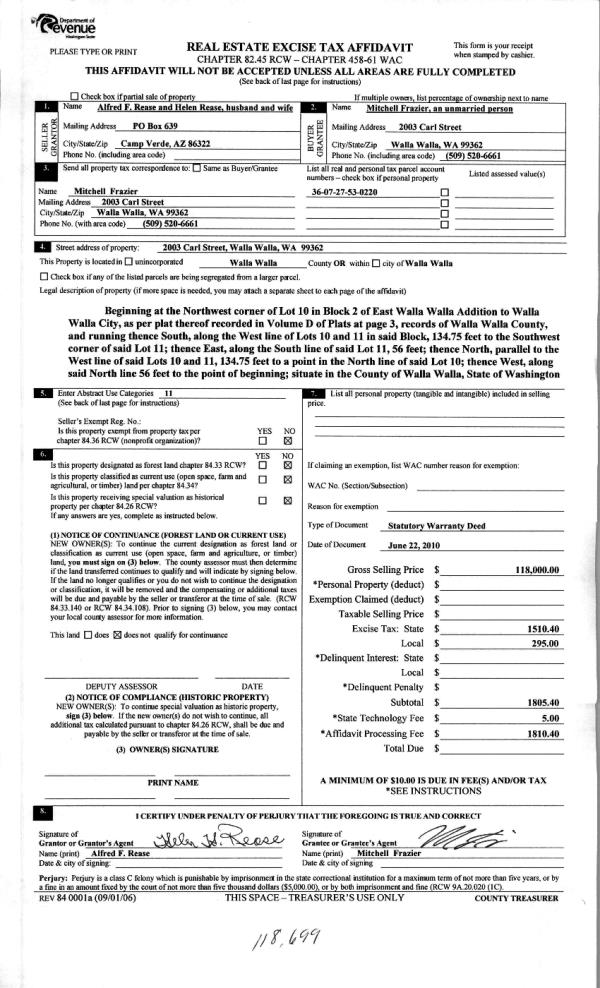 | 2 | 06/30/2010 | WARRANTY D | WARRANTY DEED | REASE, ALFRED F & HELEN | FRAZIER, MITCHELL | | | $118,000.00 | 118699 | 2010-05093 |