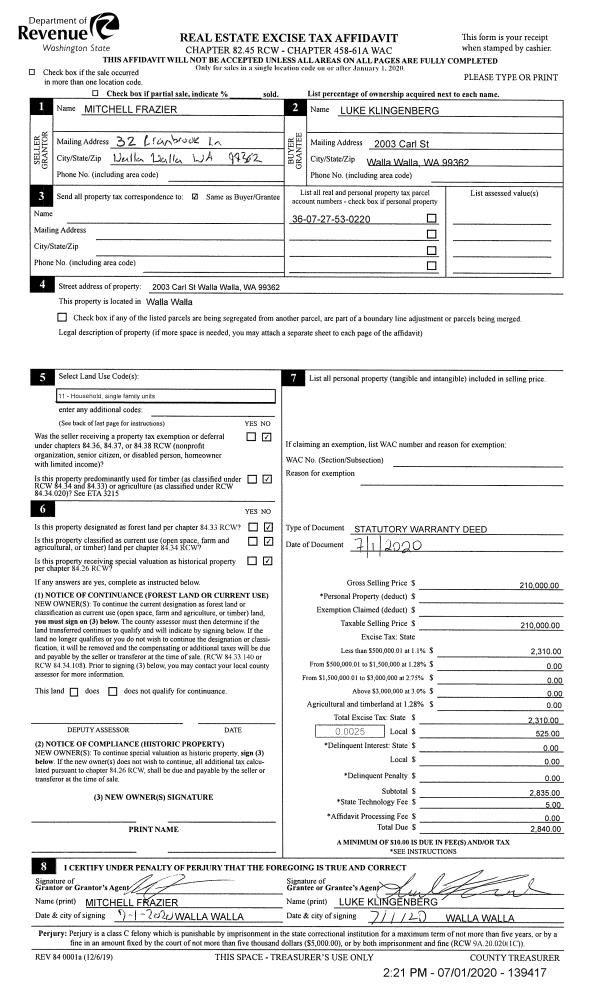 | 1 | 07/01/2020 | SWD | STATUTORY WARRANTY DEED | FRAZIER MITCHELL | KLINGENBERG LUKE | | | $210,000.00 | 139417 | 2020-06189 |