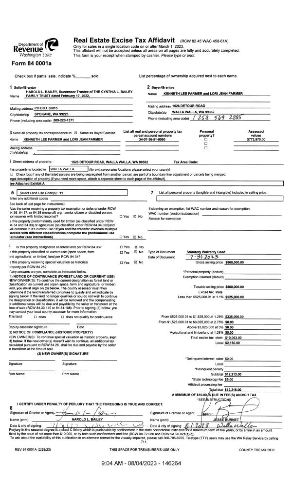| 1 | 08/04/2023 | SWD | STATUTORY WARRANTY DEED | BAILEY CYNTHIA L FAMILY TRUST | FARMER KENNETH LEE & LORI JEAN | | | $860,000.00 | 146264 | 2023-04452 |
