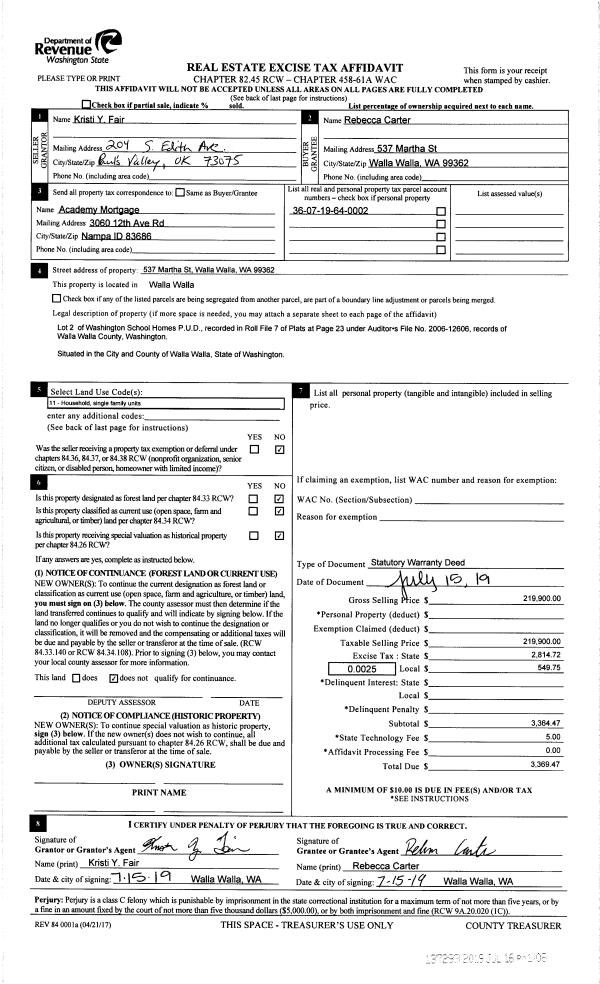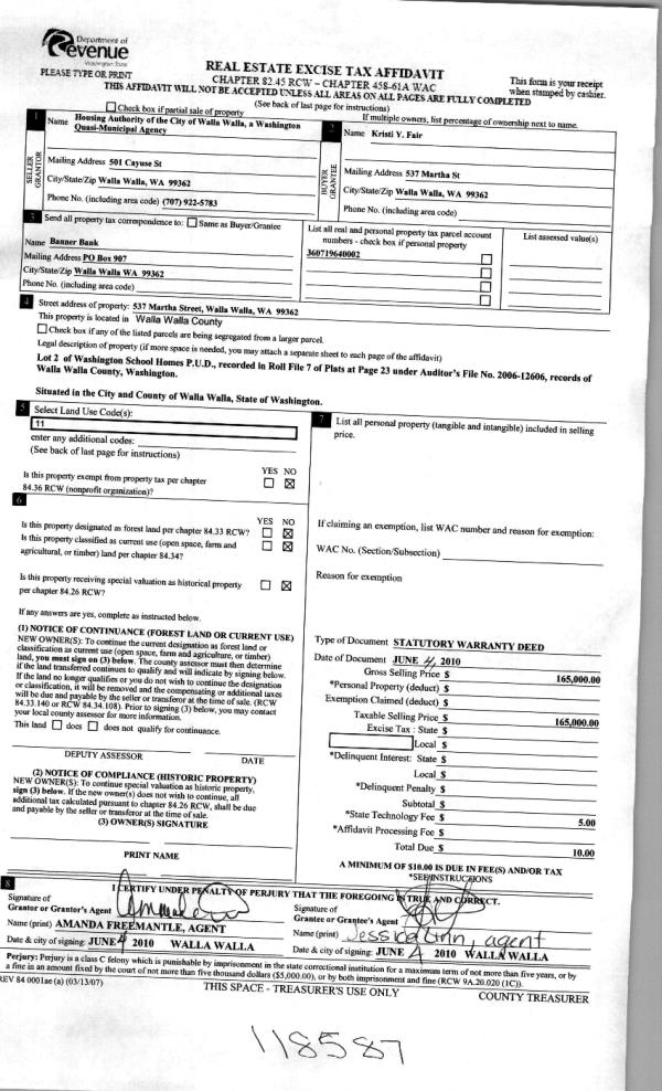 | 2 | 06/07/2010 | WARRANTY D | WARRANTY DEED | WALLA WALLA HOUSING AUTHORITY | FAIR, KRISTI Y | | | $165,000.00 | 118587 | 2010-04374 |