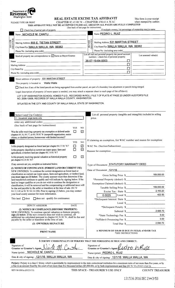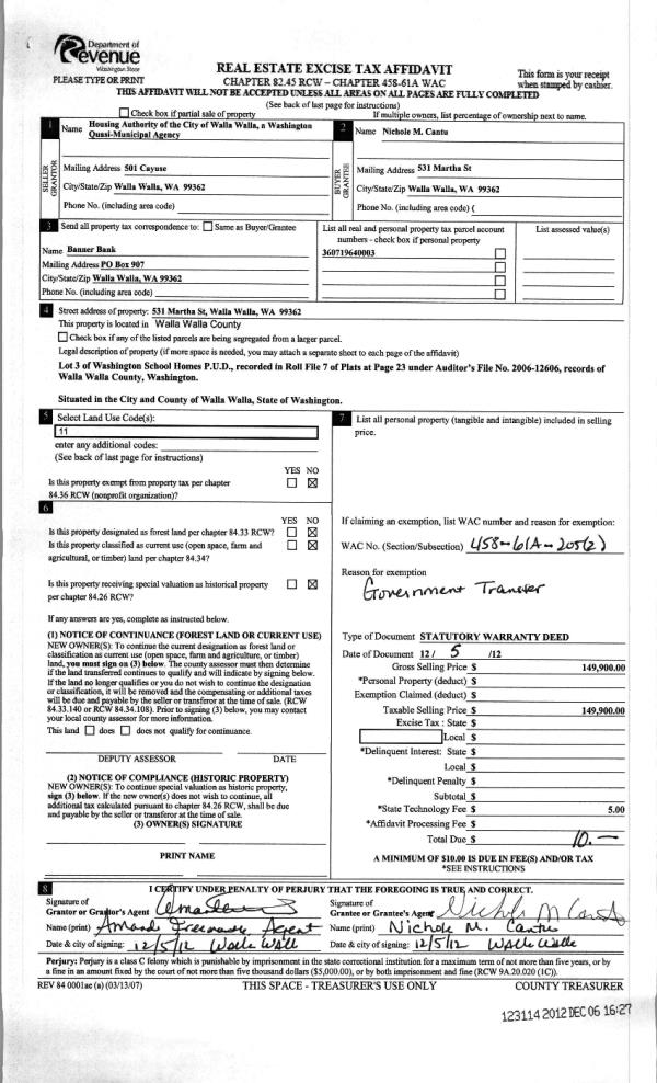 | 4 | 12/06/2012 | WARRANTY D | WARRANTY DEED | WALLA WALLA HOUSING AUTHORITY | CANTU, NICHOLE M | | | $149,900.00 | 123114 | 2012-10876 |