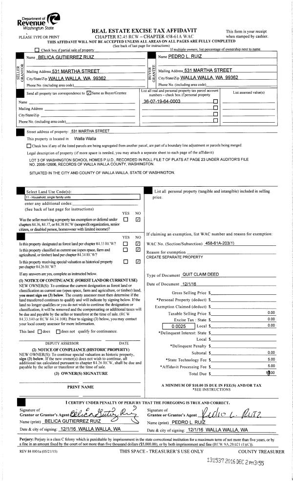 | 2 | 12/02/2016 | QCD | QUIT CLAIM DEED | RUIZ BELICA GUTIERREZ | RUIZ PEDRO L | | | | 131537 | 2016-09901 |