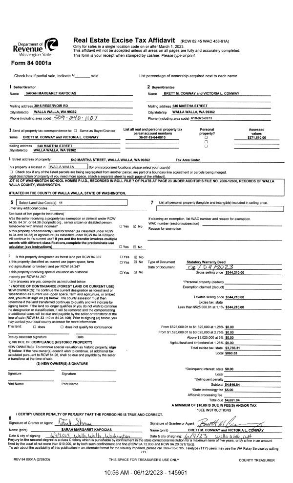 | 1 | 06/12/2023 | SWD | STATUTORY WARRANTY DEED | KAPOCIAS SARAH MARGARET | CONWAY BRETT M & VICTORIA L | | | $344,210.00 | 145951 | 2023-03197 |