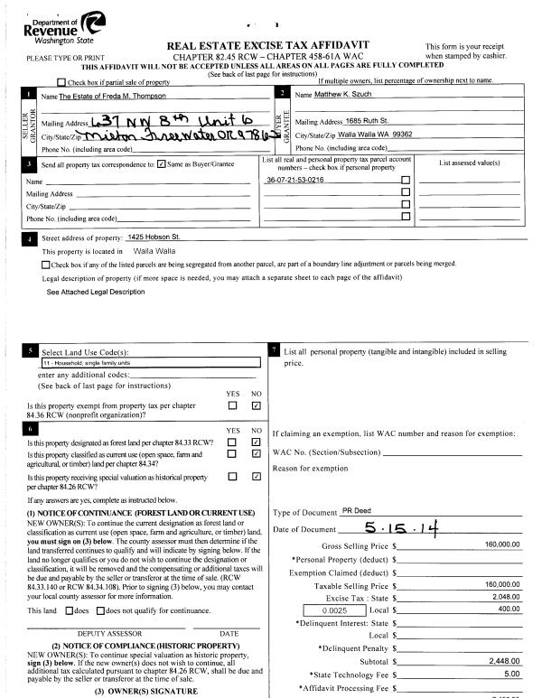 | 5 | 05/15/2014 | DPR | DEED OF PERSONAL REPRESENTATIVE | THOMPSON FREDA M | SZUCH MATTHEW K | | | $160,000.00 | 125886 | 2014-03293 |