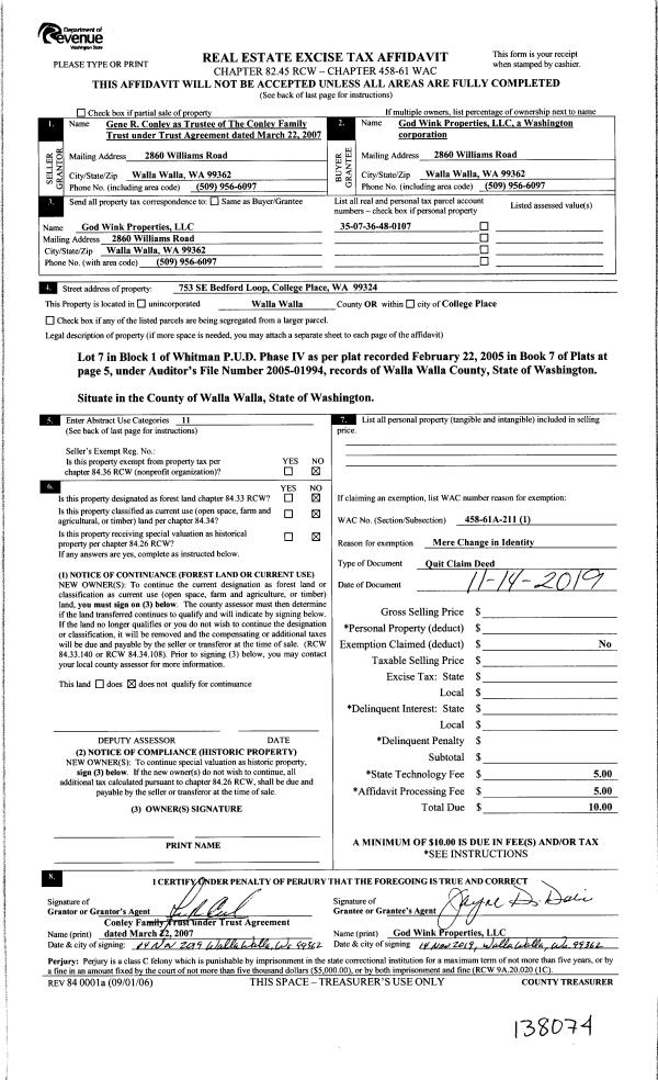 | 5 | 11/14/2019 | QCD | QUIT CLAIM DEED | CONLEY GENE R & ANNETTE L TRUSTEES OF THE | GOD WINK PROPERTIES LLC | | | $0.00 | 138074 | 2019-09390 |