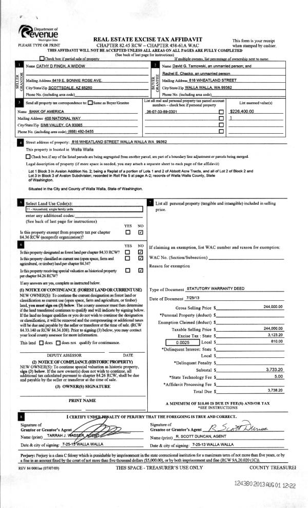 | 4 | 08/01/2013 | WARRANTY D | WARRANTY DEED | FINCH, CATHY D | TARNOWSKI, DAVID G | | | $244,000.00 | 124380 | 2013-07818 |