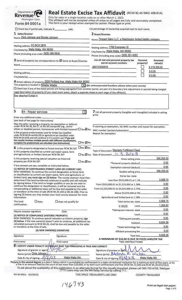 | 1 | 11/06/2023 | REAL ESTAT | REAL ESTATE CONTRACT | JOHNSON CHRIS & BROOKE | 7IMPACT SALON LLC | | | $506,250.00 | 146743 | 2023-06472 |