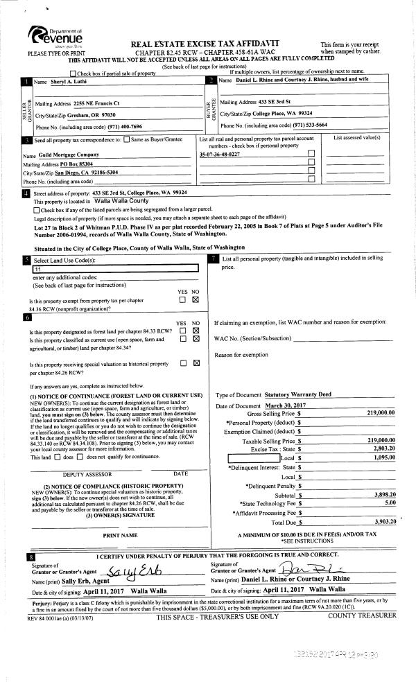 | 2 | 04/12/2017 | SWD | STATUTORY WARRANTY DEED | LUTHI SHERYL | RHINE DANIEL & COURTNEY | | | $219,000.00 | 132192 | 2017-02756 |